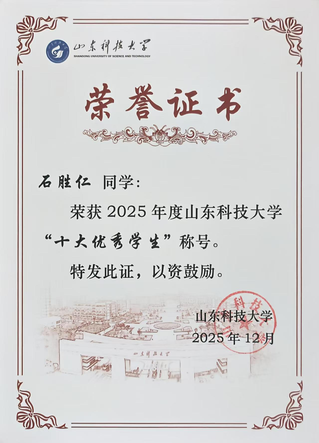 石胜仁同学获评山东科技大学“十大优秀学生”荣誉称号